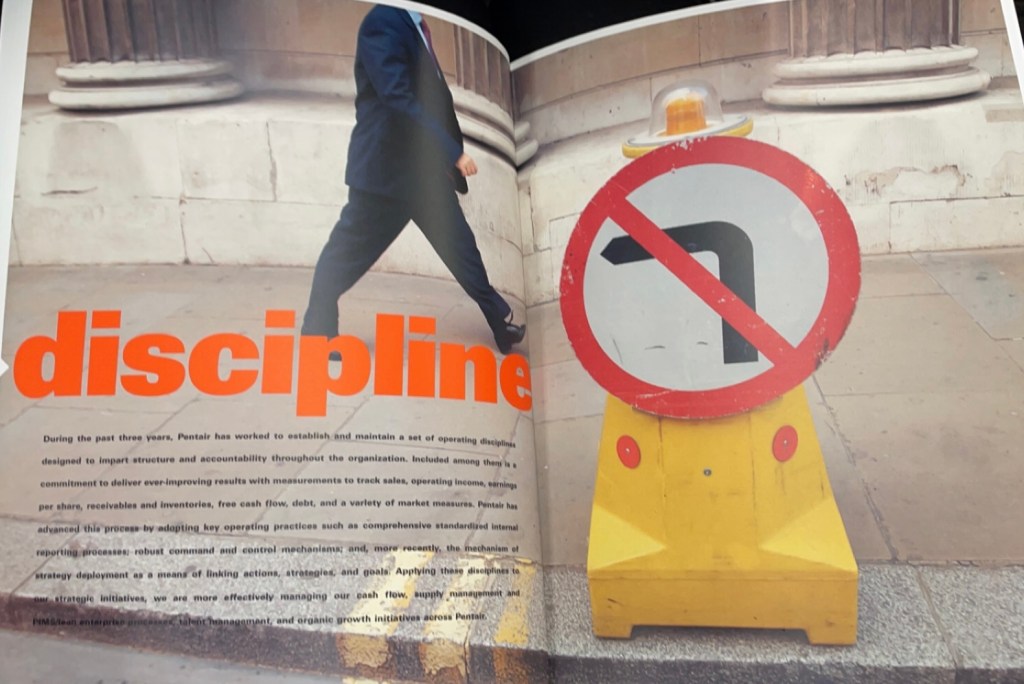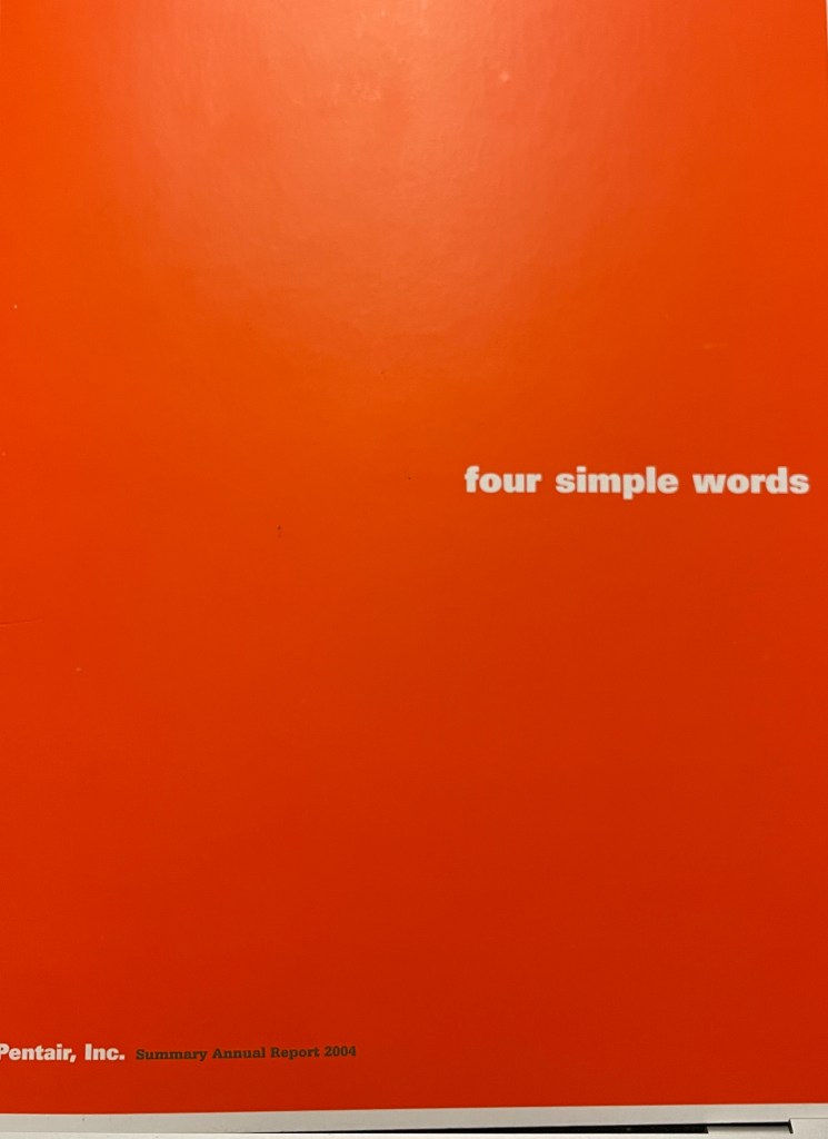 - Full Page Photographic Spreads: There are several full/multi-page photographic spreads featured throughout the design. These spreads were used to highlight specific words that were associated with Pentair. It is likely that these singular words are a part of their core beliefs/values.