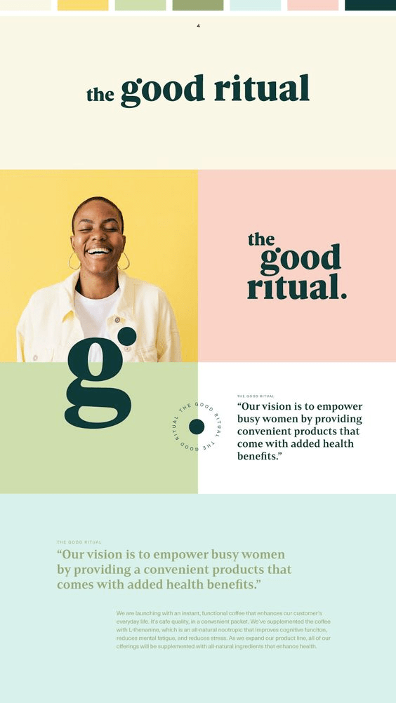 I feel that Good Ritual invested heavily in creating an effective brand identity system. Starting with the brandmark, featuring a heavy weighted serif typeface. The use of such a bold and strong wordmark emphasizes strength and stability in the company. The use of a serif typeface instead of a sans serif suggests that their brand is associated with luxury or top of the line quality. Additionally, the isolated “G” serves as a secondary isolated brandmark design. The top right circle in the G brandmark adds personality to the overall brandmark system.